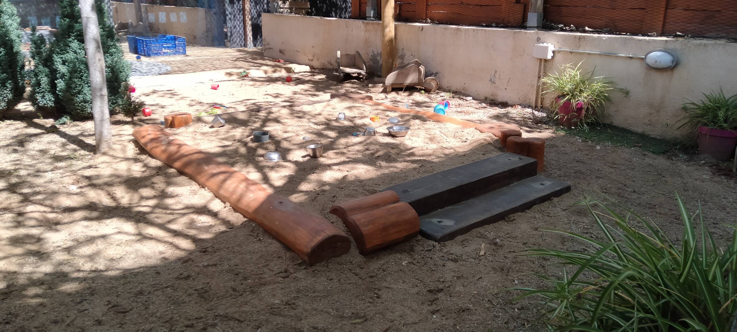 Arenero fabricado con troncos, combinando piezas en vertical y horizontal. Incorpora 2 elementos motrices para entrar o salir (rampa y escaleras), especialmente pensadas para la fase del gateo.