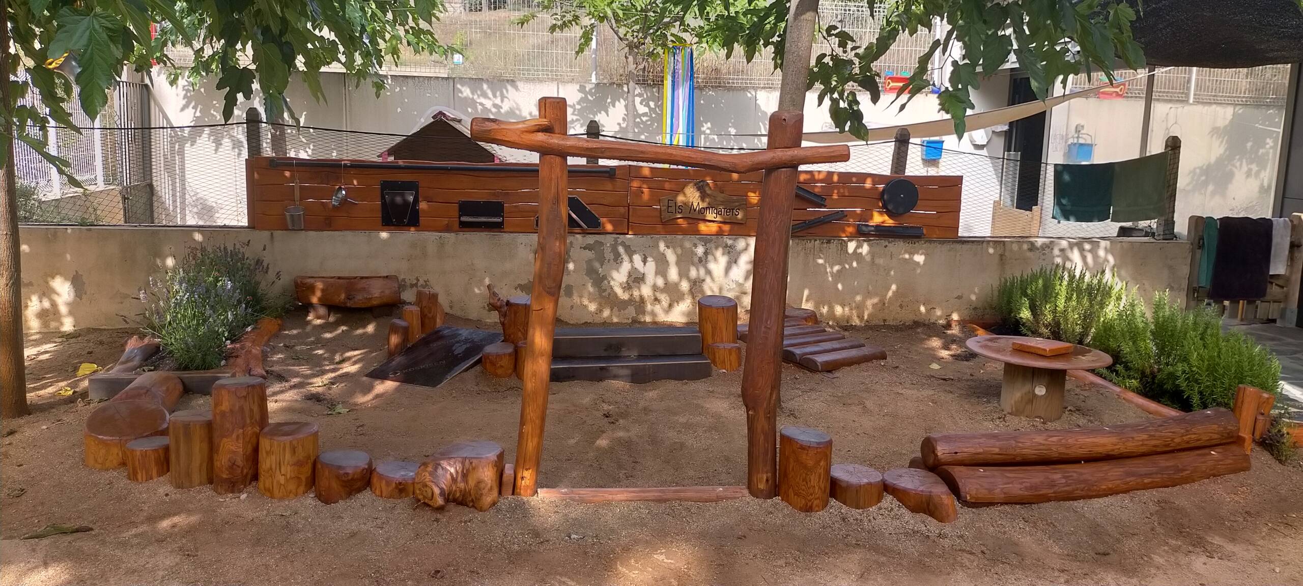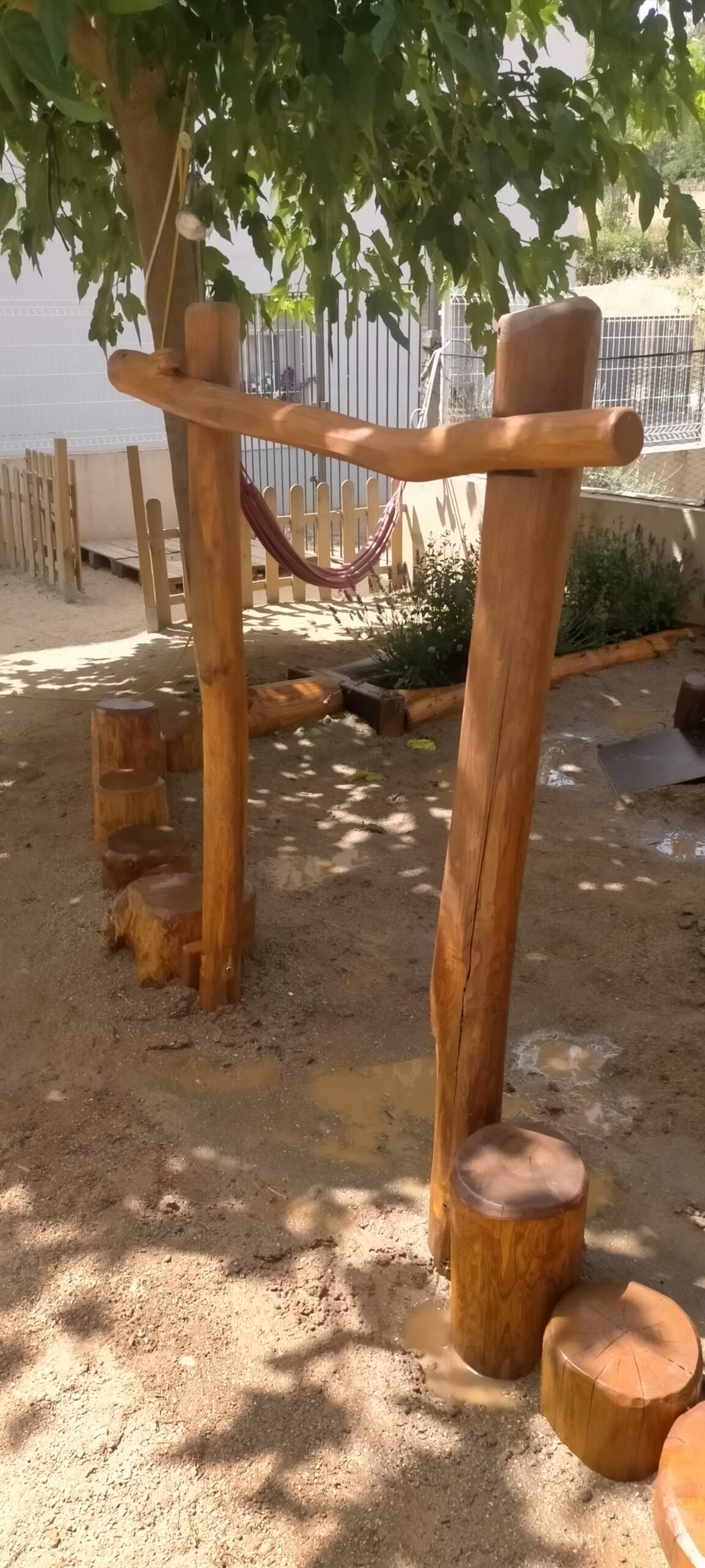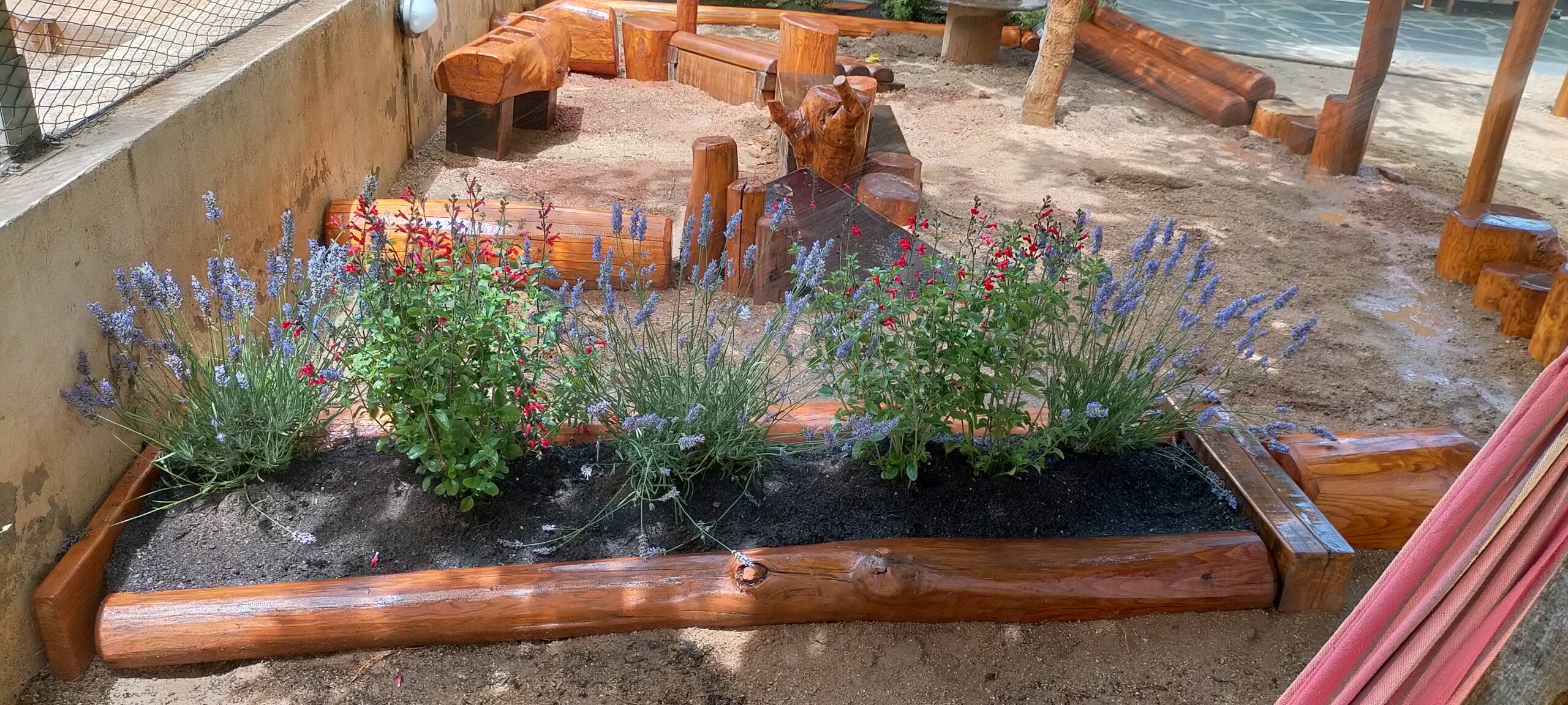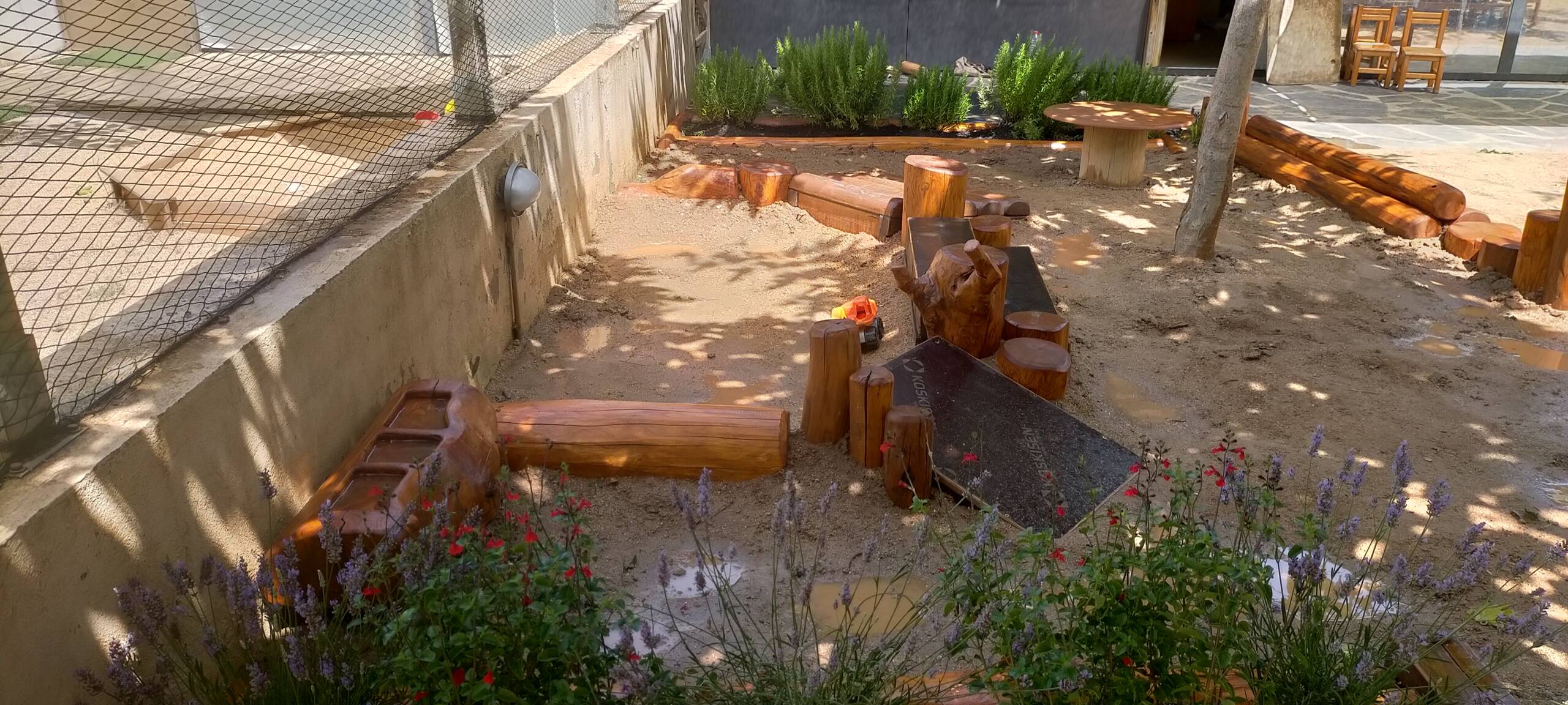 Arenero fabricado con troncos, combinando piezas en vertical y horizontal, para convertirse a la vez en un circuito de equilibrio. Incorpora un segundo nivel dentro del arenero, con elementos motrices para entrar y salir. También incluye dos jardineras laterales con plantas aromáticas autóctonas.