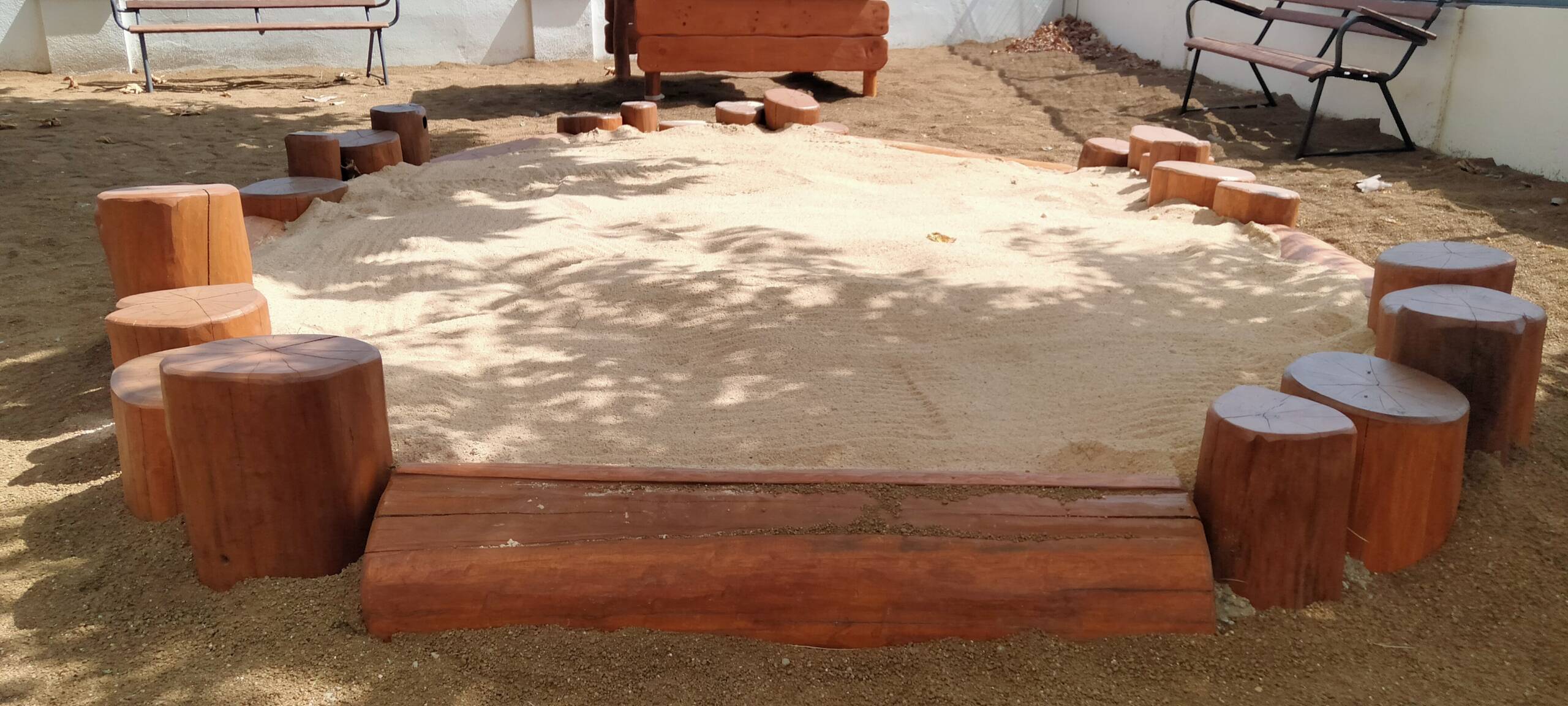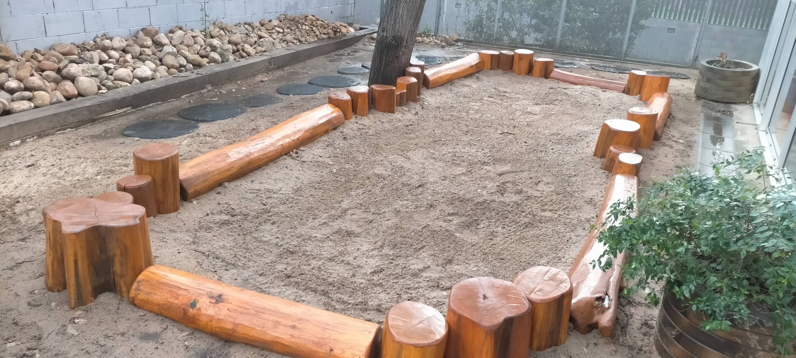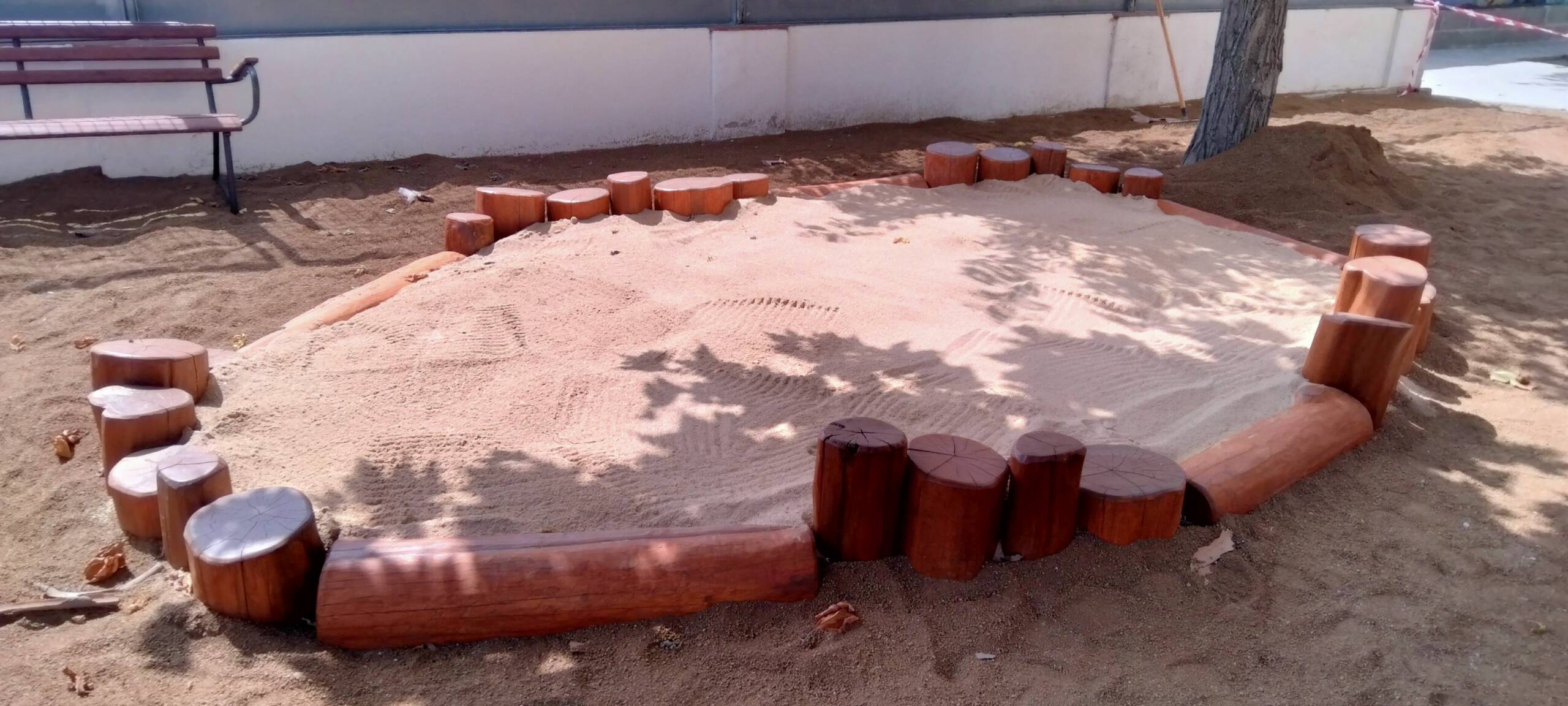 Arenero fabricado con troncos, combinando piezas en vertical y horizontal, para convertirse a la vez en un circuito de equilibrio.