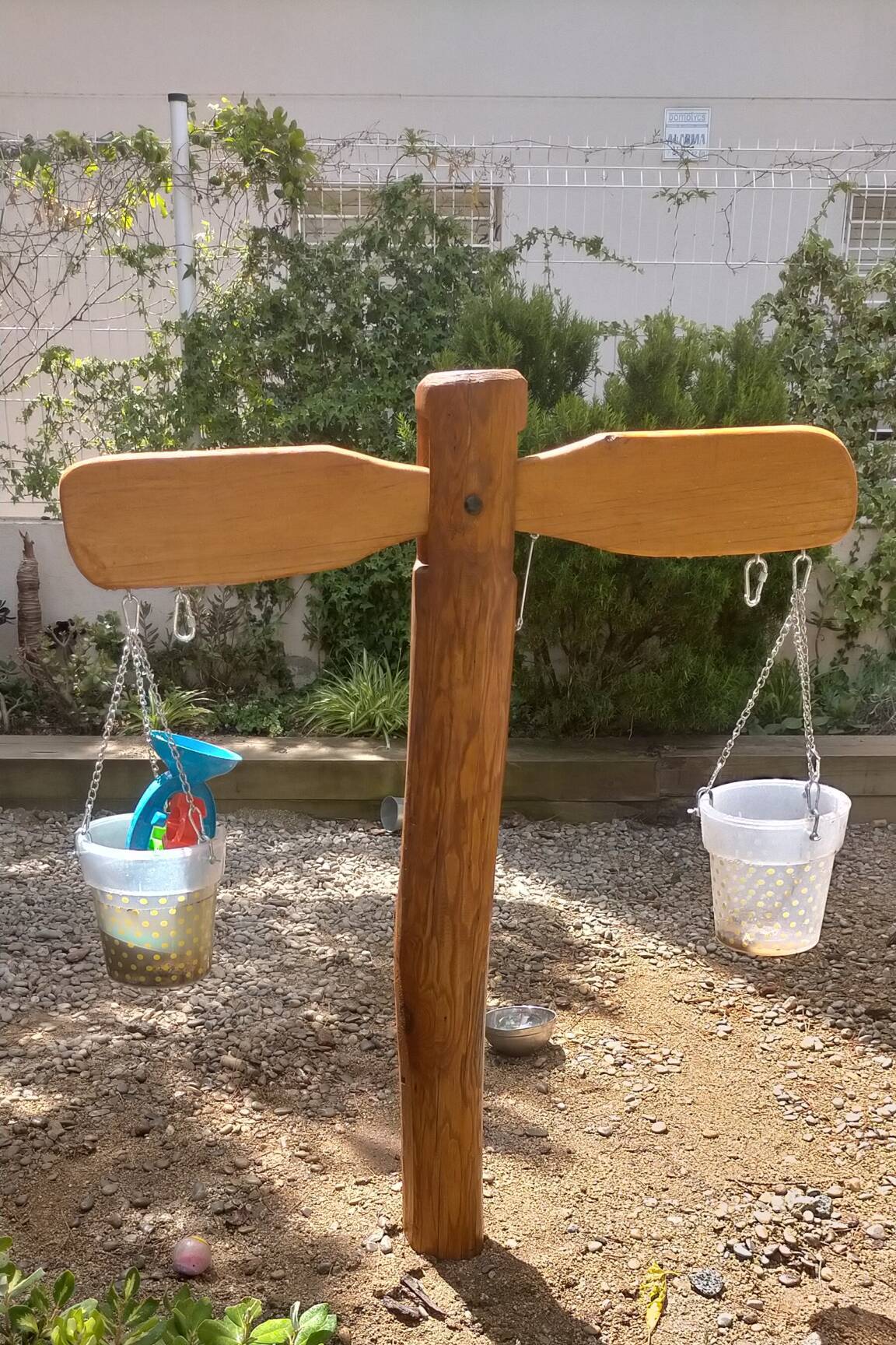 Conjunto formado por balanza con dos cubos.