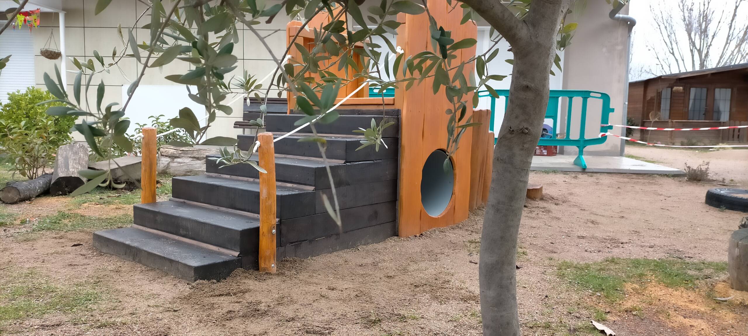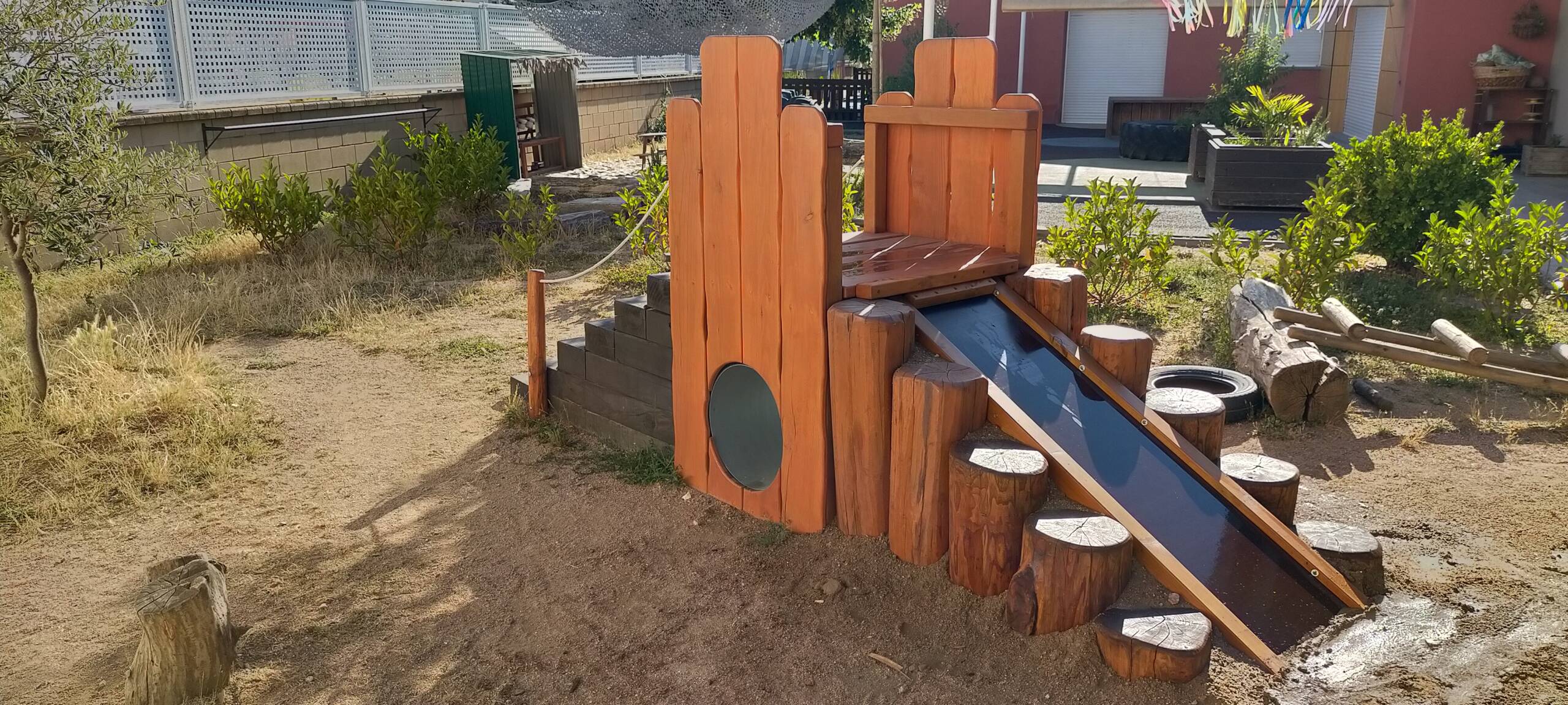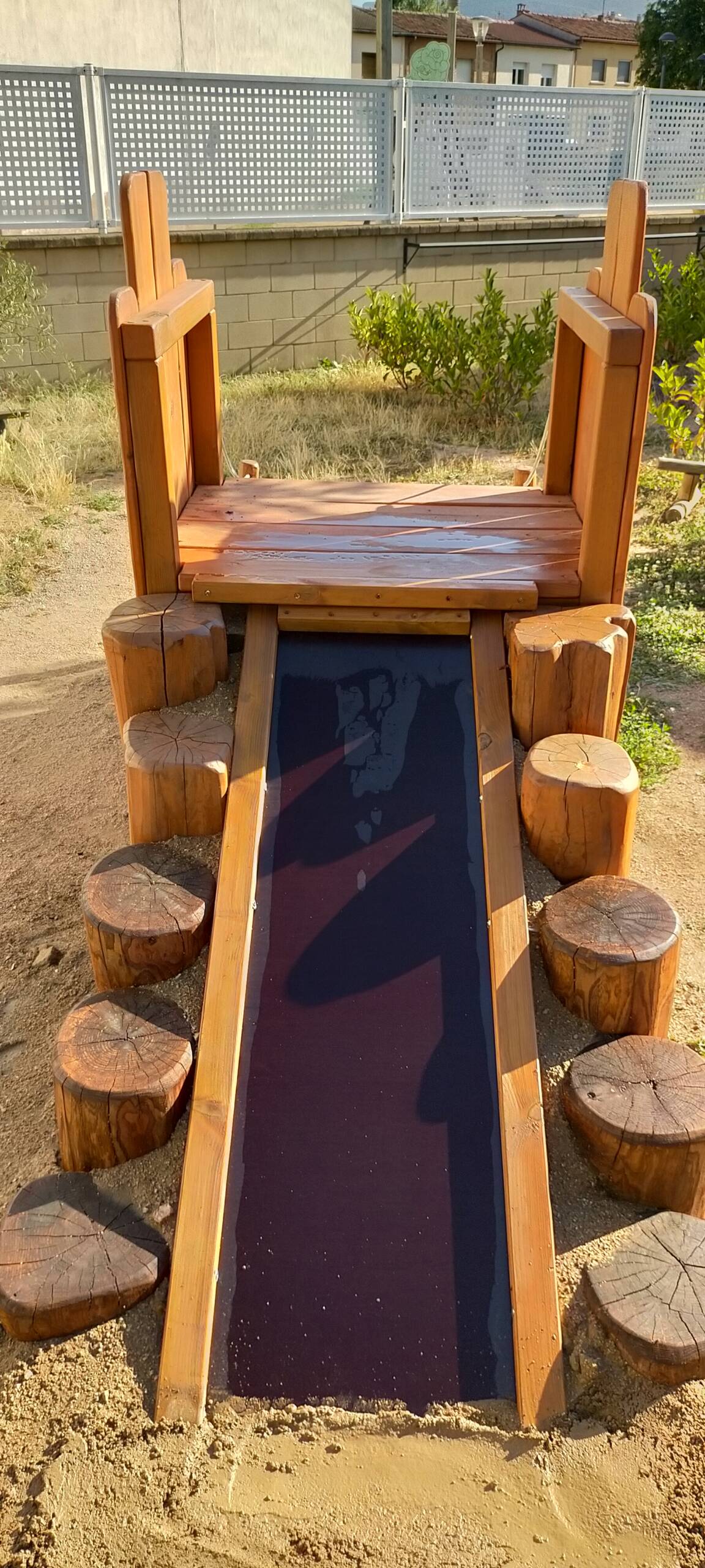 Conjunto formado por cuerpo central elevado con tubo inferior, rampa de madera a modo de tobogán delimitada por troncos y escalera de 6 peldaños.
