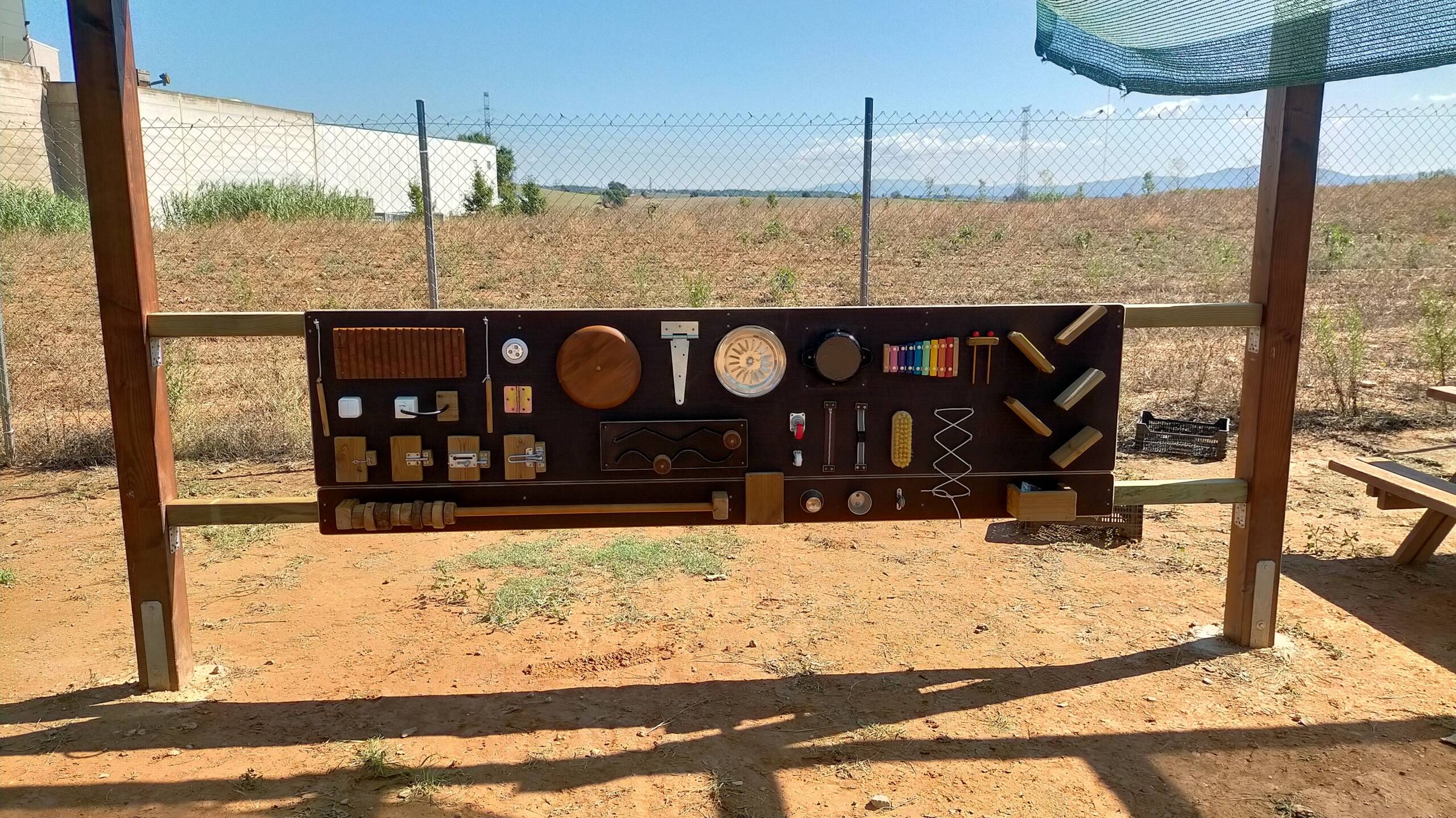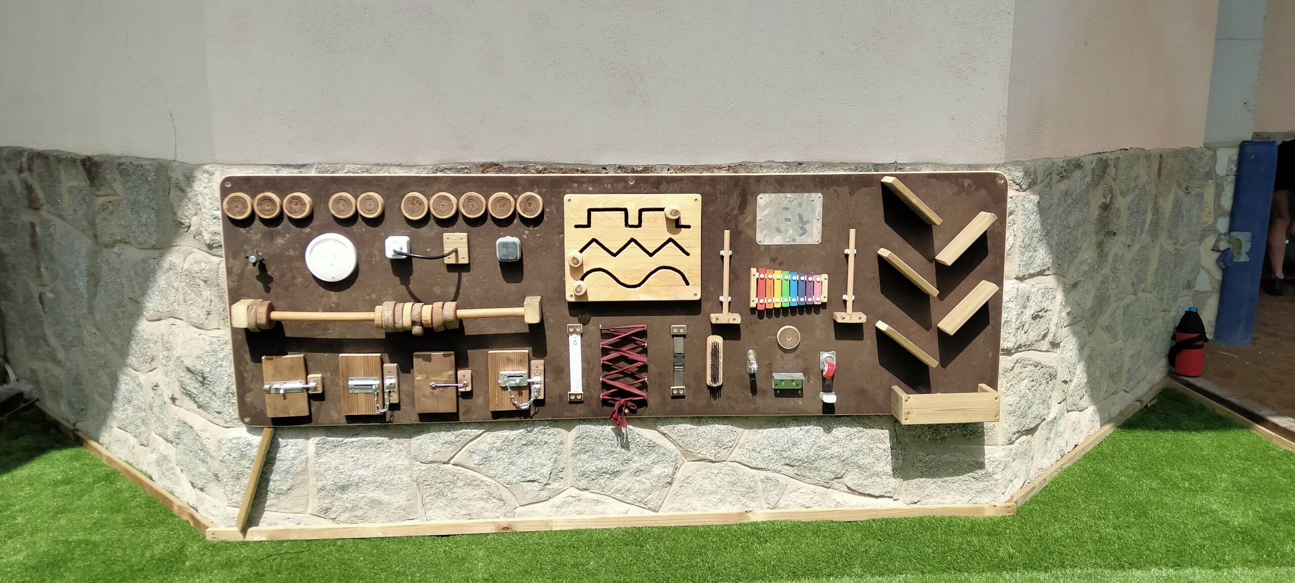 Paneles con diferentes materiales pensados para trabajar diferentes aspectos (motricidad fina, música, coordinación,etc.).