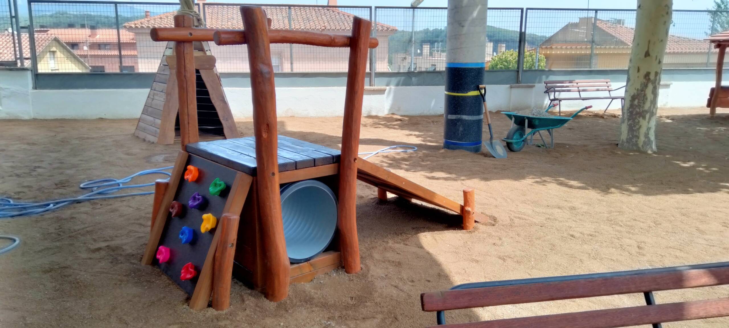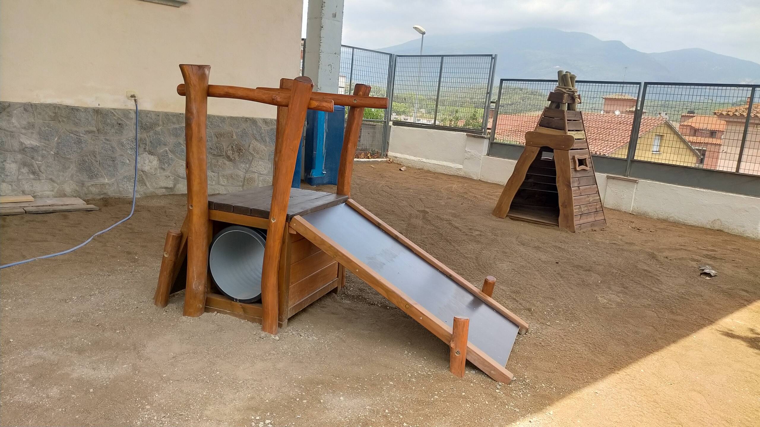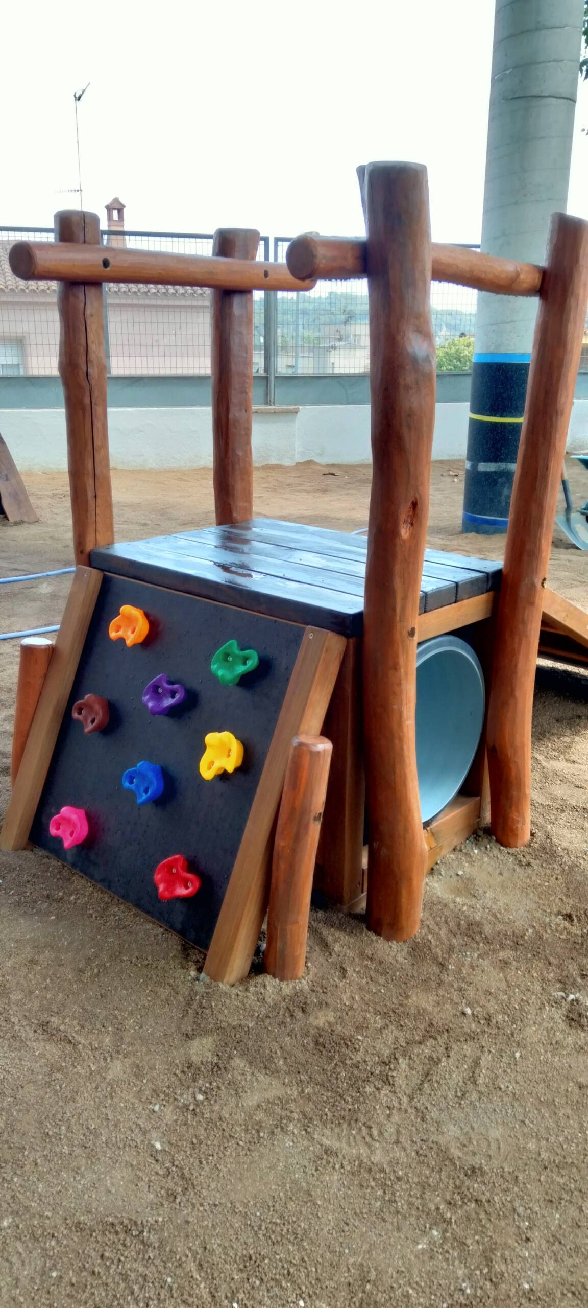 Conjunto formado por cuerpo central elevado con tubo inferior, rampa de madera a modo de tobogán y subida con presas infantiles de escalada.